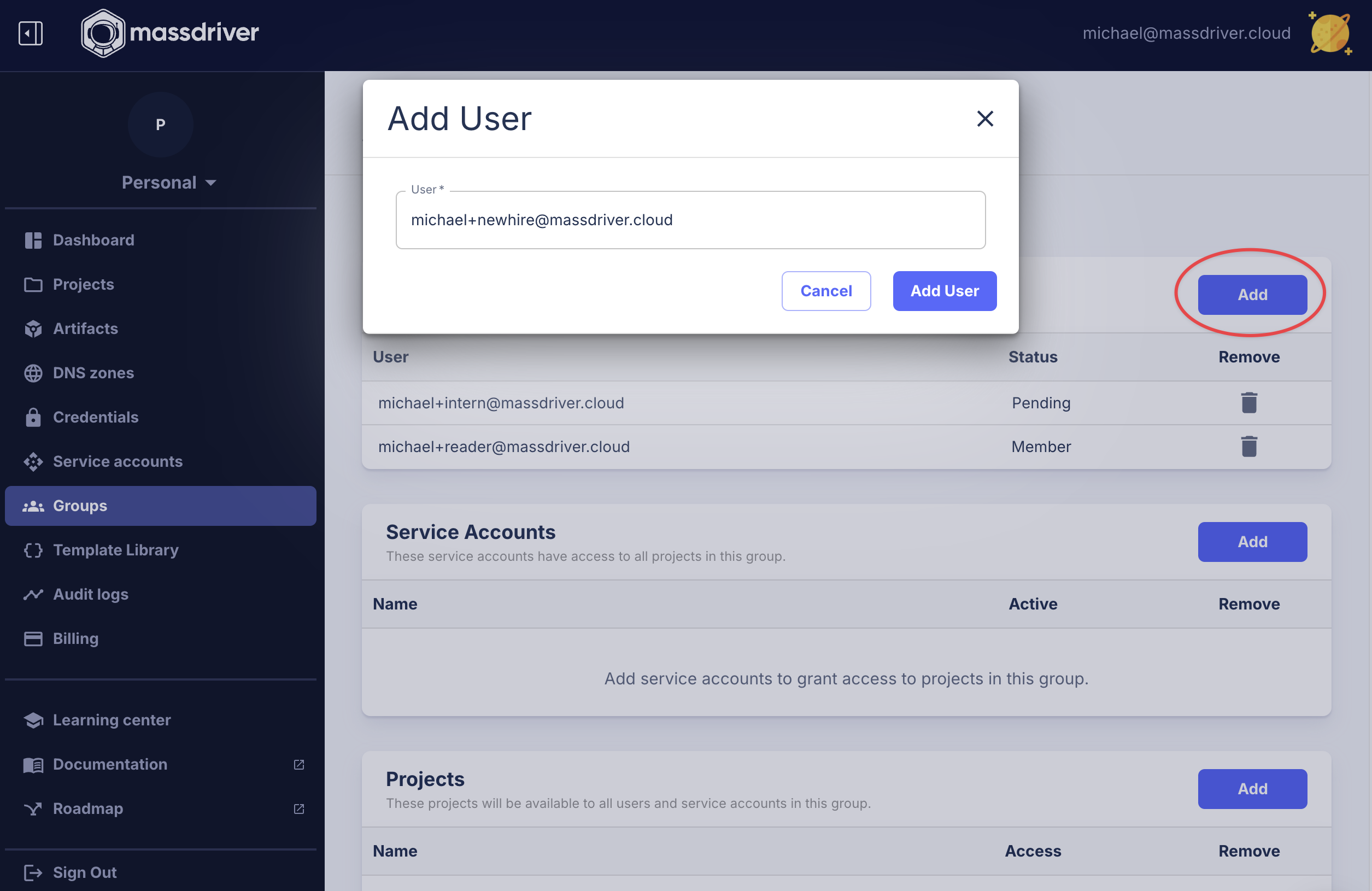 Add, enter the email of the user you wish to invite and clickAdd User.